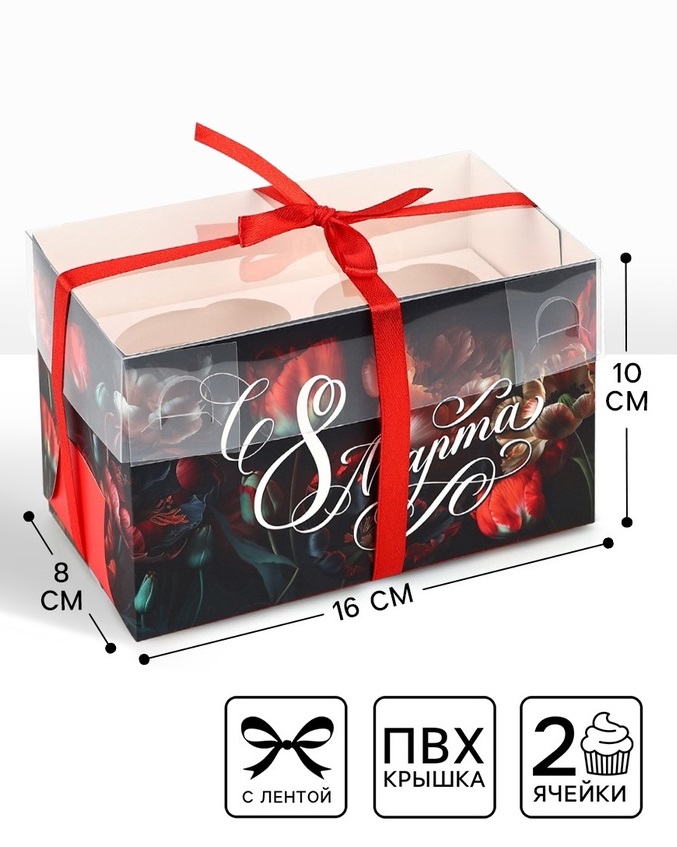 Купить Коробка для 2 капкейков 8 марта, 16×8×10 см S8491 по лучшей цене с доставкой - интернет магазин №1 в России