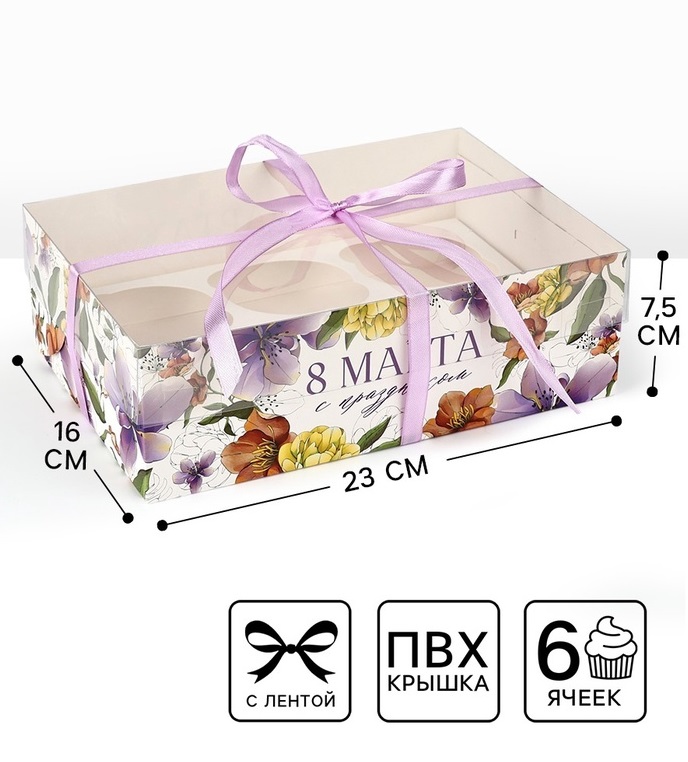 Купить Коробка для 6 капкейков 8 марта, 23×16×7.5 см S8492 по лучшей цене с доставкой - интернет магазин №1 в России