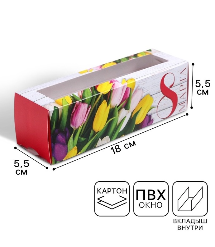 Коробка для макарун 8 марта букет тюльпанов, 5.5×18×5.5 см