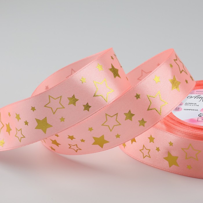 Лента атласная с тиснением Звёзды, 25 мм, 18м, розовая/золотая