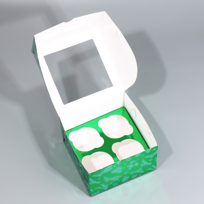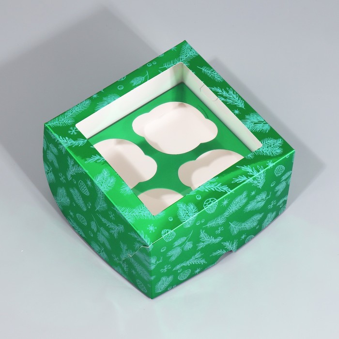 Купить Коробка для 4 капкейков новогодняя с окном Веточки, 16х16х10см, металлик S7370 по лучшей цене с доставкой - интернет магазин №1 в России