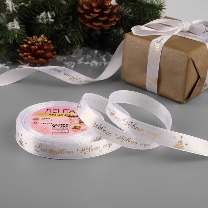 Купить Лента атласная 15мм*23м, белый/золото, С Новым Годом! S7891 по лучшей цене с доставкой - интернет магазин №1 в России