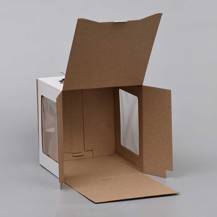 Коробка для торта 26x26x28 см, 2 окна, белая, с ручками за 165 ₽ - купить в Москве оптом и в розницу.