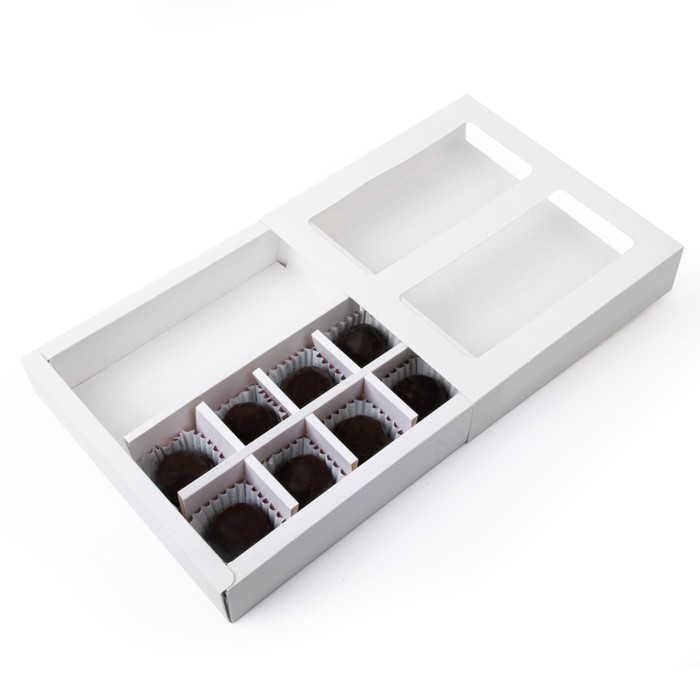 Коробка для 8 конфет + шоколад, с окном, белая, 17.7×17.8×3.8 см за 85 ₽ - купить в Москве оптом и в розницу.