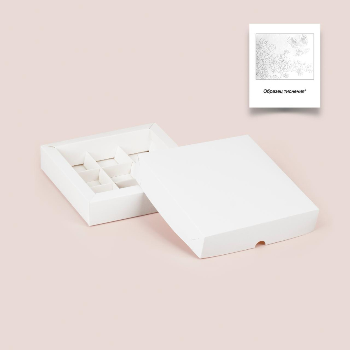 Коробка для 9 конфет с тиснением, белая за 85 ₽ - купить в Москве оптом и в розницу.