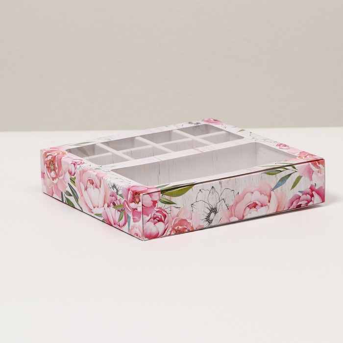 Коробка для конфет и шоколада 8 конфет + шоколад, с окном, пионы, 17.7x17.85x3.85 см за 105 ₽ - купить в Москве оптом и в розницу.
